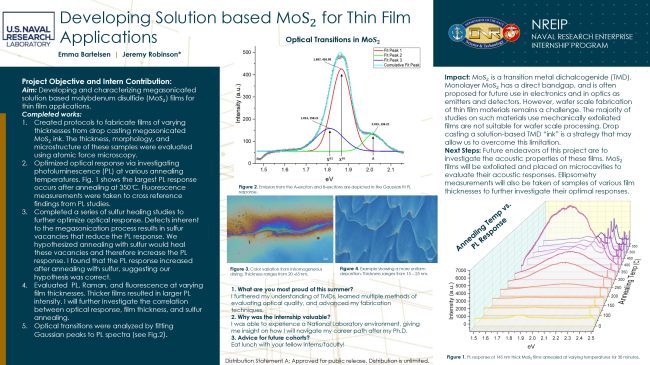 Emma interned at the U.S. Naval Research Laboratory (NRL) through the Naval Research Enterprise Internship Program (NREIP), funded by the Office of Naval Research (ONR). Under the mentorship of Dr. Jeremy Robinson, her research involved fabricating and characterizing solution-based molybdenum disulfide (MoS₂) thin films. She developed protocols for drop-casting films with controlled thicknesses, analyzing their morphology and microstructure using atomic force microscopy (AFM). To enhance film optical properties, Emma conducted photoluminescence (PL) and Raman spectroscopy across various annealing conditions, demonstrating improved optical responses through sulfur vacancy healing. This research addresses existing challenges in wafer-scale MoS₂ film fabrication, advancing scalable methods suitable for electronic and optoelectronic applications.