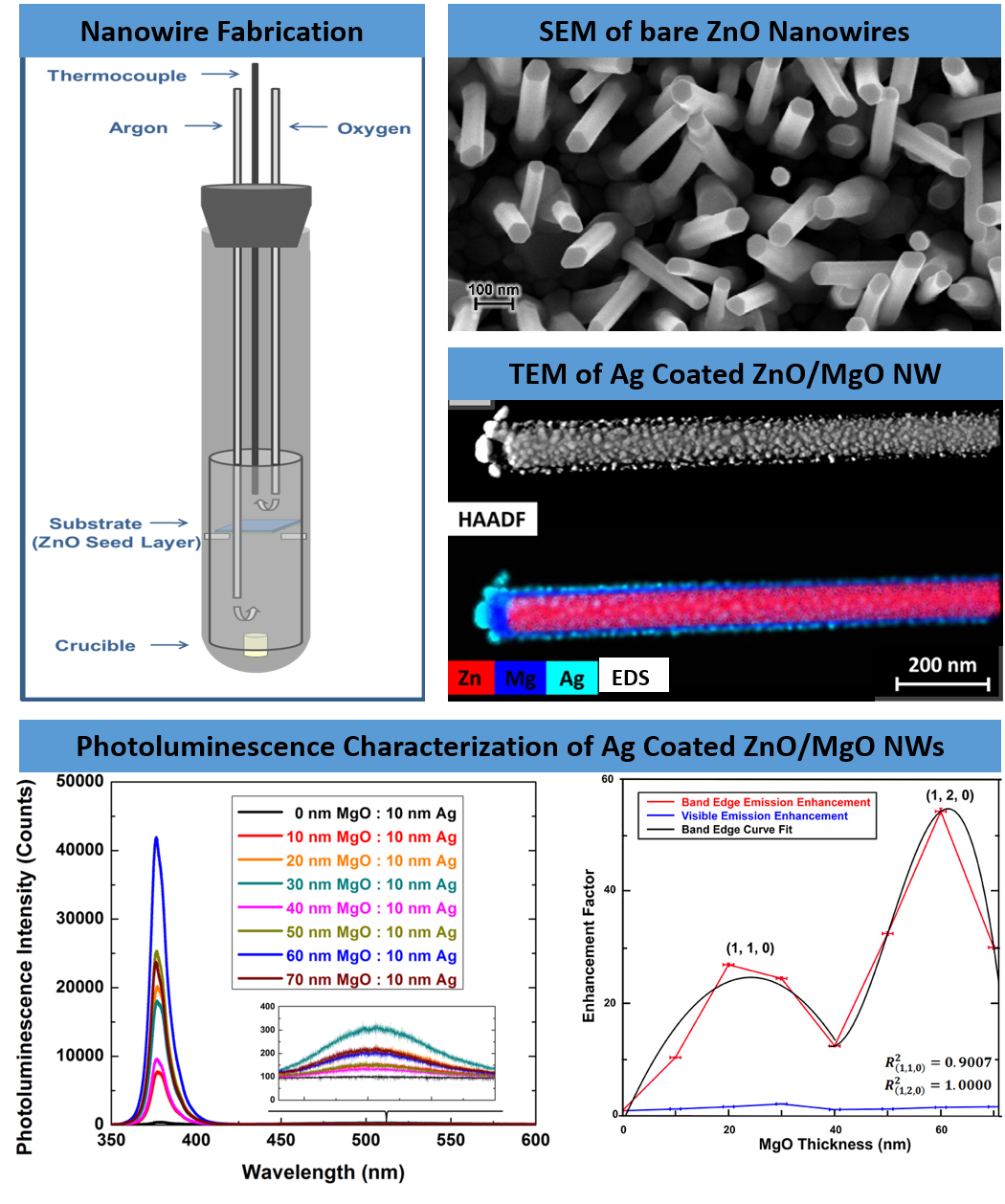 As the need for high-efficiency optoelectronic devices continues to grow, ZnO has emerged as one of the most promising materials for tunable optical emissions. With a wide direct bandgap of 3.37 eV and a large exciton binding energy of 60 meV, ZnO is a more thermally stable near-UV emitter than the commonly used semiconductor GaN. It is the focus of this research to study the physics of using plasmonics and optical cavity effects to tune and enhance the emission of ZnO within a high-quality, three-dimensional nanowire architecture. By uniformly functionalizing ZnO nanowires with metal nanoparticles (Ag, Au, and Al), it is possible to greatly enhance or quench the emission of ZnO via plasmonic coupling to the luminescent centers. In addition, coating ZnO nanowires with specific thicknesses of an insulator layer has yielded optical cavity effects via Fabry-Perot resonators inside the core-shell structures, further enhancing the band-edge luminescence. This research has the potential to establish the core-shell plasmonic ZnO nanowire structure as a high-efficiency platform for optoelectronic applications.