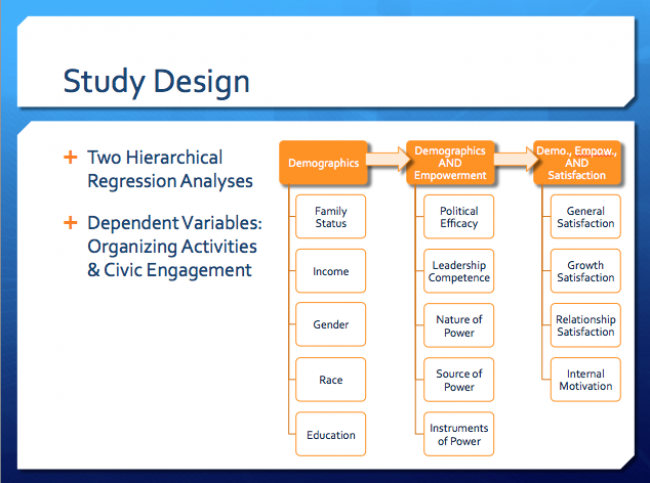 Community organizing is a participatory process in which individuals affected by social issues exert power through collective action. This process aims to affect change by combating systemic issues at the local level and requires engagement from community members. The current study explores which factors are significant predictors of engagement for volunteers within a faith-based community organizing network. Two dependent variables are examined and compared: one measuring participation in activities explicitly sanctioned by the organizing coalition, and another concerning civic engagement more broadly constructed. Potential predictors stemming from three overarching areas are analyzed: demographics, empowerment, and perceived organizational satisfaction. This study utilizes survey data collected by organizational leaders in the community organizing network. Results show that demographic factors were not predictive of engagement for either dependent variable, emotional empowerment was more predictive of engagement than cognitive empowerment, and perceived organizational satisfaction, specifically perceived satisfaction concerning individual growth, predicted engagement in organizing activities but not civic engagement more broadly constructed. Findings concerning empowerment and perceived organizational satisfaction extend previous work related to empowerment theory and social exchange theory. By understanding which factors lead to greater engagement within their members, community organizing networks may be able to create conditions that lead to more sustained engagement and long-term participation, thus increasing their ability to create change. Questions? Contact Ryan Schooley: rschooley11@gmail.
