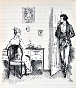 Thompson’s illustration beautifully captures the ambivalence of Austen’s iconic couple. Lizzy, poised to write, meets Darcy’s gaze. He stands in the open door. His feet, dancer-like, suggest movement; but is he stepping in or backing out?
