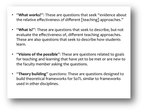 Teaching and Learning (2000) offers the most frequently cited taxonomy of SoTL work, categorized by the kinds of questions a project asks and answers (pp. 4-5). The box to the right summarizes each of the four kinds of projects she identifies. The video below offers Pat Hutchings’s reflections on her SoTL taxonomy.