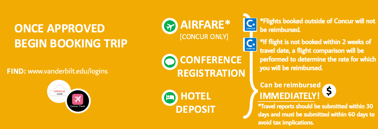 NOTE: In order to be reimbursed, Airfare MUST be booked through Vanderbilt’s partnered travel agency, World Travel Service (WTS), by means of the Concur portal in Oracle. Vanderbilt University users can access Concur via the link on the VU logins webpage: https://www.vanderbilt.edu/logins/. This brings VU users to the logins screen where you select Oracle, input your VUnet ID and Password, and securely login to the Concur site via the Oracle tiles. For more complex travel plans, you may contact WTS directly (800-526-1412) and ask for a VU representative.
