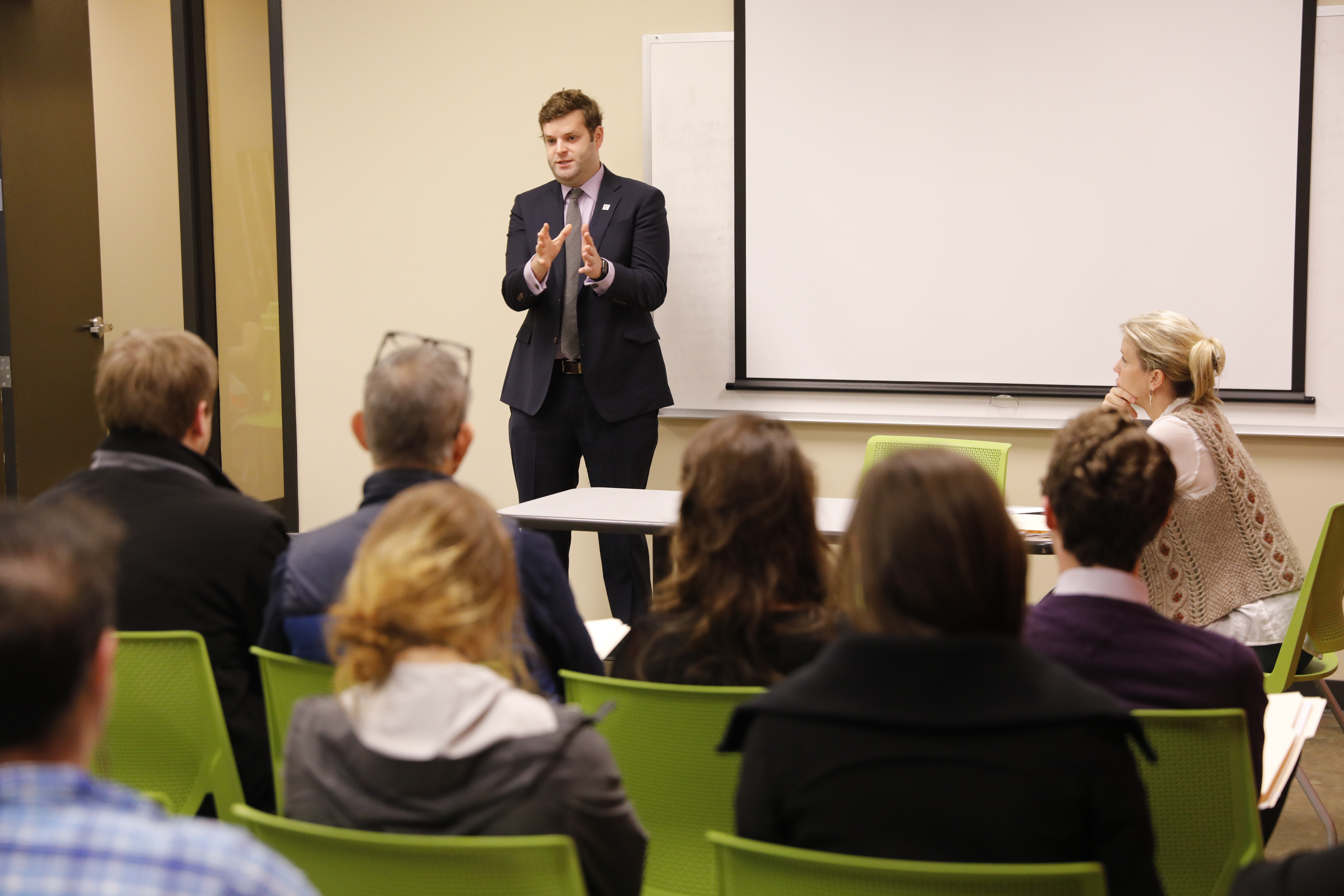 The students and faculty from the University Course Justice, Mercy and Mass Incarceration went to the courthouse on February 7 to learn about the process of adjudication. As part of that experience, students and faculty met with members of the Public Defender’s Office. After a brief orientation, they broke into groups of 4-5 and headed to the courthouse, where they sat in courtrooms and witnessed the proceedings. They learned that 95 percent of cases are “pled out,” meaning they never go to trial. Instead, defendants are offered a plea deal. As part of that process, they typically plead guilty to a lesser charge than the one they were charged with. They also learned that over 85 percent of people charged with a crime have right to a public defender. This means that 85 percent of all people charged are below the poverty line. The experience in court demonstrated this fact: most people in the court were poor, people of color and/or immigrants. While the criminal code itself tends to criminalize poverty, it is also true that poor communities also experience higher rates of policing and therefore are more subject to criminal charges. These facts help account for the overrepresentation of poor people in the criminal justice system.