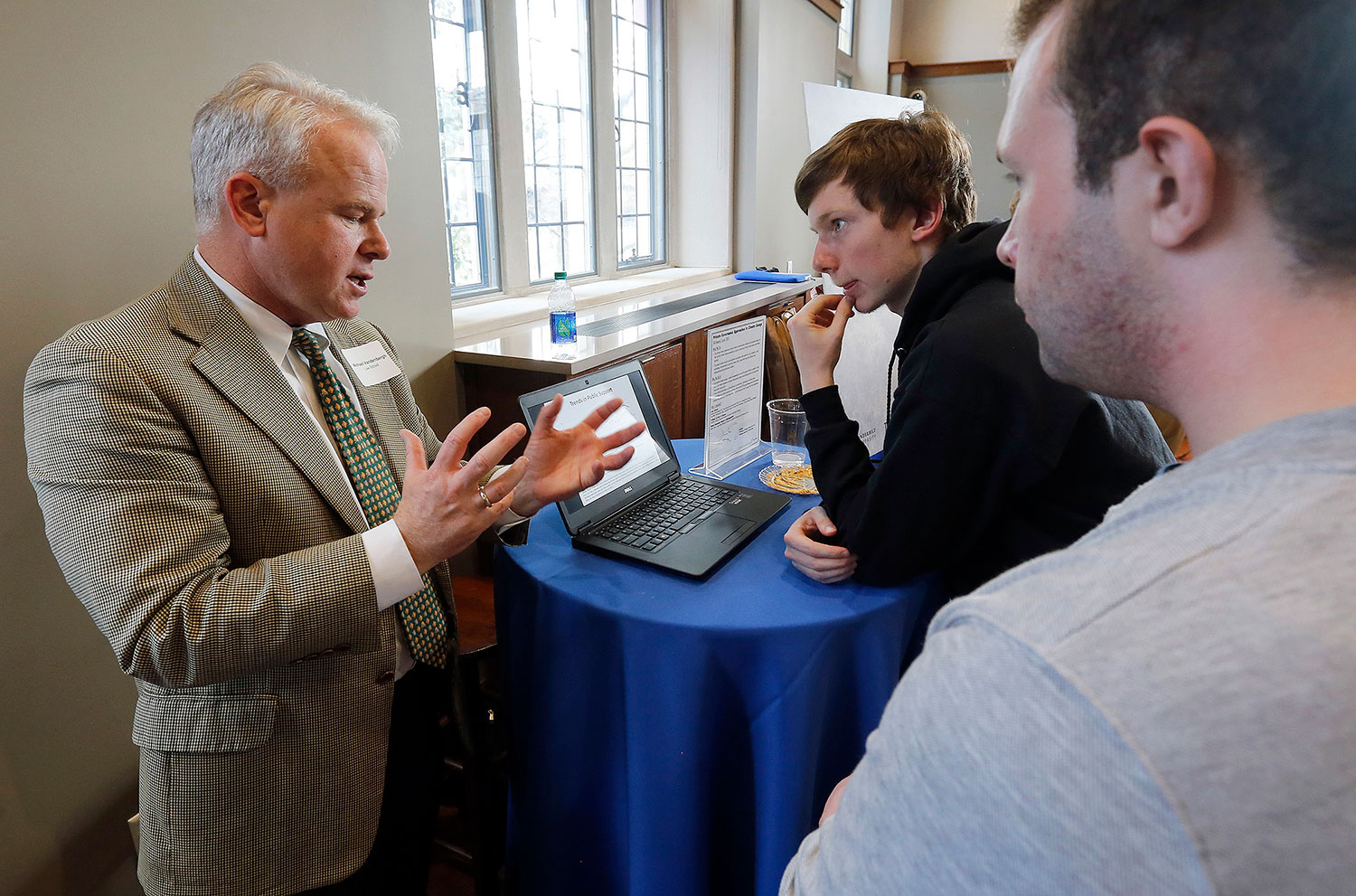 Law School professor Michael Vandenbergh (left) discusses his 2015 TIPs award “Private Governance Approaches to Climate Change.”