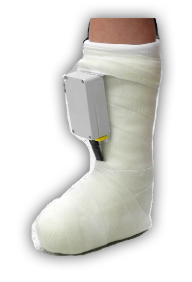 The device as it would appear embedded into a total contact cast. The fiber optics would reach around the foot and deliver the light to the wound located on the bottom of the patient’s foot.