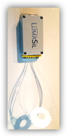A previous design iteration showing the light & power source unit above with fiber optics leading out to a small silicone halo.